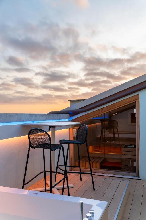 Wellness Suite 2 ágyas erkélyes: (kb.45m2) - oldalról tengerre néző, elegáns, romantikus lakosztály, mely épület legmagasabb pontján található, ahonnan csodálatos kilátás nyílik a Viareggio-ra és a tengerre.